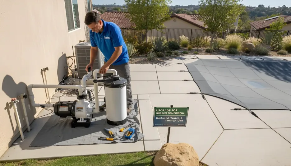 Pool covers are strongly encouraged and sometimes required because they significantly reduce evaporation in sunny microclimates like La Jolla, Poway, and many East County communities. Modern water-saving equipment also plays a role. Variable-speed pumps, efficient filtration systems, automatic level controls, and leak-resistant plumbing help homeowners stay compliant with conservation standards.