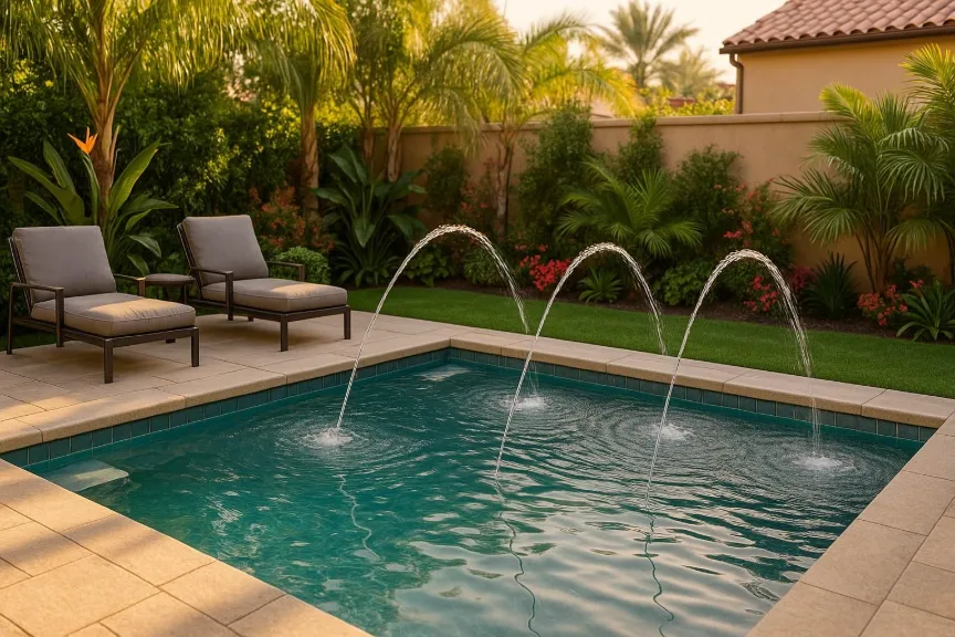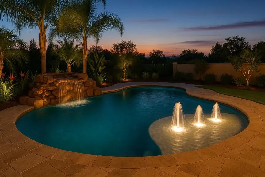 Why choose just one? Many homeowners combine waterfalls and fountains to create a dynamic, layered water experience. For example, a freeform pool might feature a rock waterfall at one end and a series of deck jets arching gracefully across the water.