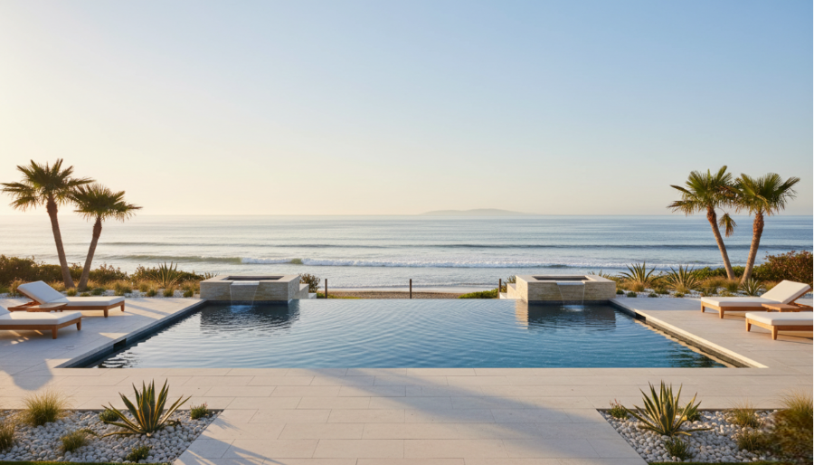 Building a pool near the Pacific Ocean introduces unique challenges. Salt air can accelerate wear on certain materials, making product selection critical. Stainless steel components, corrosion-resistant fixtures, and high-quality sealants help protect long-term performance.
