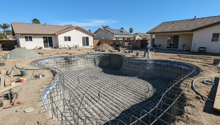 Construction phases generally include excavation, steel reinforcement, plumbing and electrical installation, gunite application, tile and coping work, decking, equipment setup, and final plaster. Inspections occur at multiple stages to ensure compliance with city standards.