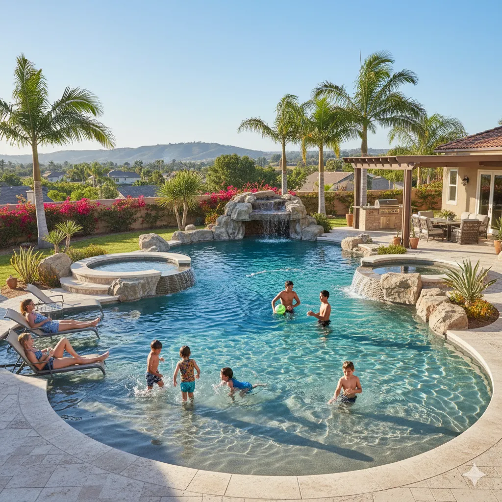 Inland Carlsbad neighborhoods like Calavera Hills benefit from family-friendly pool designs with wide shallow entries, play areas, and BBQ patio integrations.