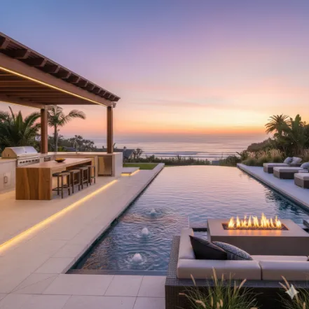 Solana Beach pool builders often extend their services to complete backyard transformations. Think outdoor kitchens, custom fire pits, shade pergolas, and lush landscaping designed for entertaining guests.